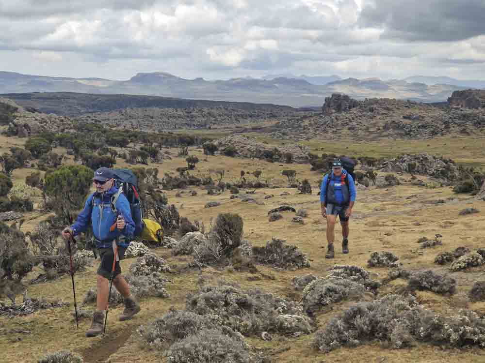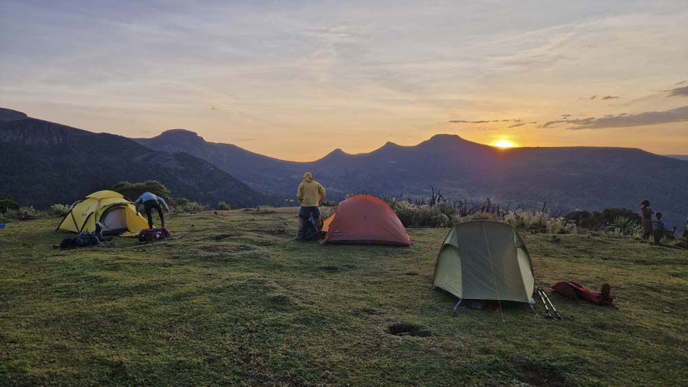 Na tábořišti stavíme stany, místní děti nosí vodu z pramene a po západu slunce se rychle ochlazuje. Brzy ráno vyrážíme na vrchol Tulu Angafu (3600 m) za dalekými výhledy a cestou pozorujeme horské nyaly (antilopy). Po návratu si teprve dáváme snídani a kratší cestou sestupujeme zpět pod hory, opět lesy jalovců, vřesovců a podokarpů.