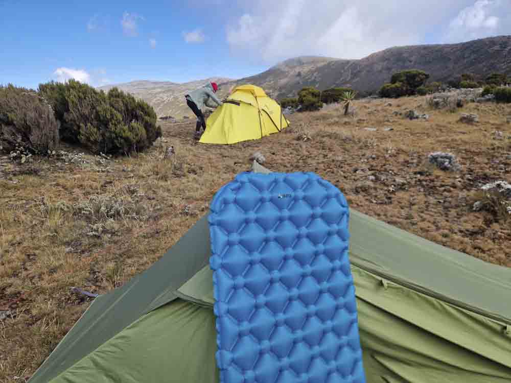 Stoupáme po dobře znatelné stezce mezi bochánky vysokohorské vegetace, míjíme malé jezírko s lobeliemi a po necelých dvou hodinách stavíme stany v sedle. Večer se zatahuje studenou mlhou a rychle zalézáme do stanů.