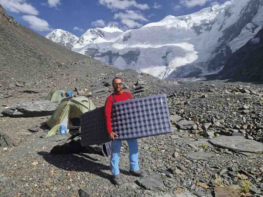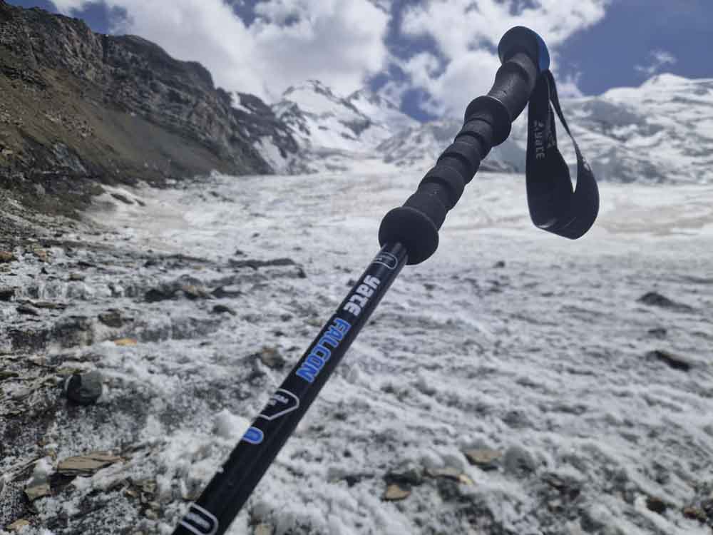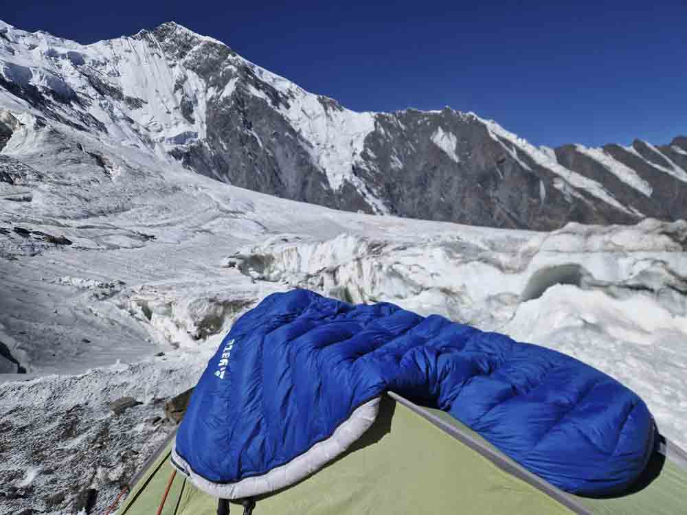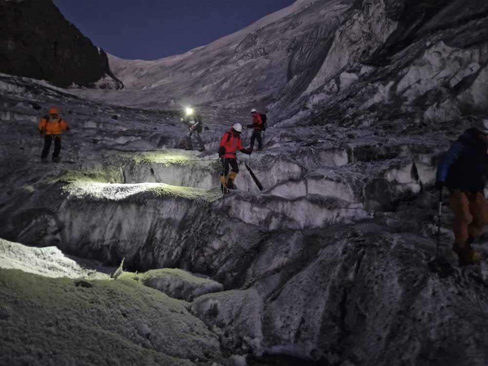 Po třetí začínáme sestup. Do sedla to jde lehce, dolů už ne – slaňujeme strmý ledový svah a míříme více vpravo, kamenné laviny jsou odpoledne častější a hrozivější. Kameny velikosti mikrovlnky skáčou po ledovci, chvílemi vstupujeme do jejich doskočiště a utíkáme do strany. V horní kotlině jsme v šest večer, slunce zapadá. Sestup po ledovci raději na laně, vlevo pod stěnami. Posledních dvacet minut v suti jdeme jen při světle mobilu. V půl osmé večer jsme zpět u stanů – unavení, ale naprosto spokojení. Polévka, čaj, spánek.