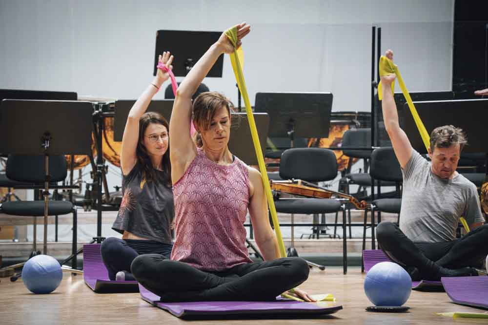 YATE dodává kompenzační a cvičební pomůcky hudebníkům Filharmonie Hradec Králové, kteří s nimi pravidelně cvičí pod vedením fyzioterapeutky. Měli jsme i možnost být u jednoho z těchto tréninků přímo na jevišti filharmonie a sledovat, jak cílené kompenzační techniky pomáhají hudebníkům udržet jejich tělo v kondici navzdory náročnému povolání.