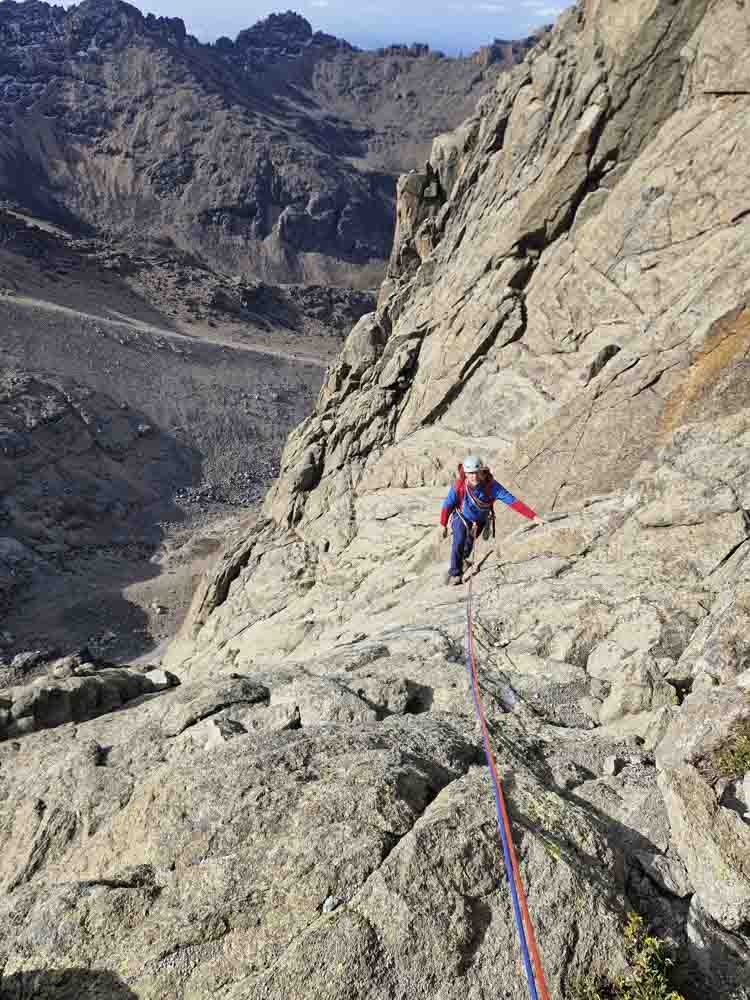 V 7:10 začínáme první délku normálky na Point John. Slunce se objevuje ve třetí délce a lezení je krásné, pevná skála nabízí dostatek míst pro jištění. Plotny, které včera vypadaly hrozivě, mají jen asi třicet metrů a s dobrou linií stupů se dají lézt kolem čtvrtého stupně.