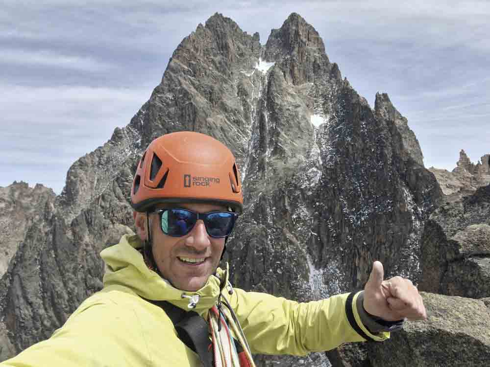 Při focení si ani nevšimneme, jak se přes hřeben převalil mrak, který během deseti minut zahalil vše kolem nás. Rychle slaňujeme dolů. Během sestupu začíná sněžit drobnými krupkami, které se na vyhřáté skále mění ve vodu. Poslední délky tak slaňujeme mezi potůčky stékající vody a lana jsou úplně promočená.