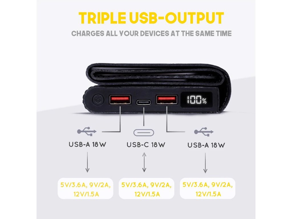 2x USB-A 18 W: 5 V/3.1 A, 9V/2 A, 12 V/1.5 A |