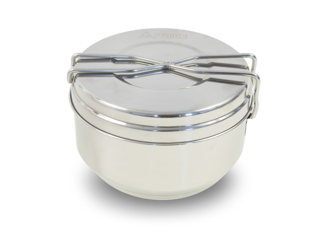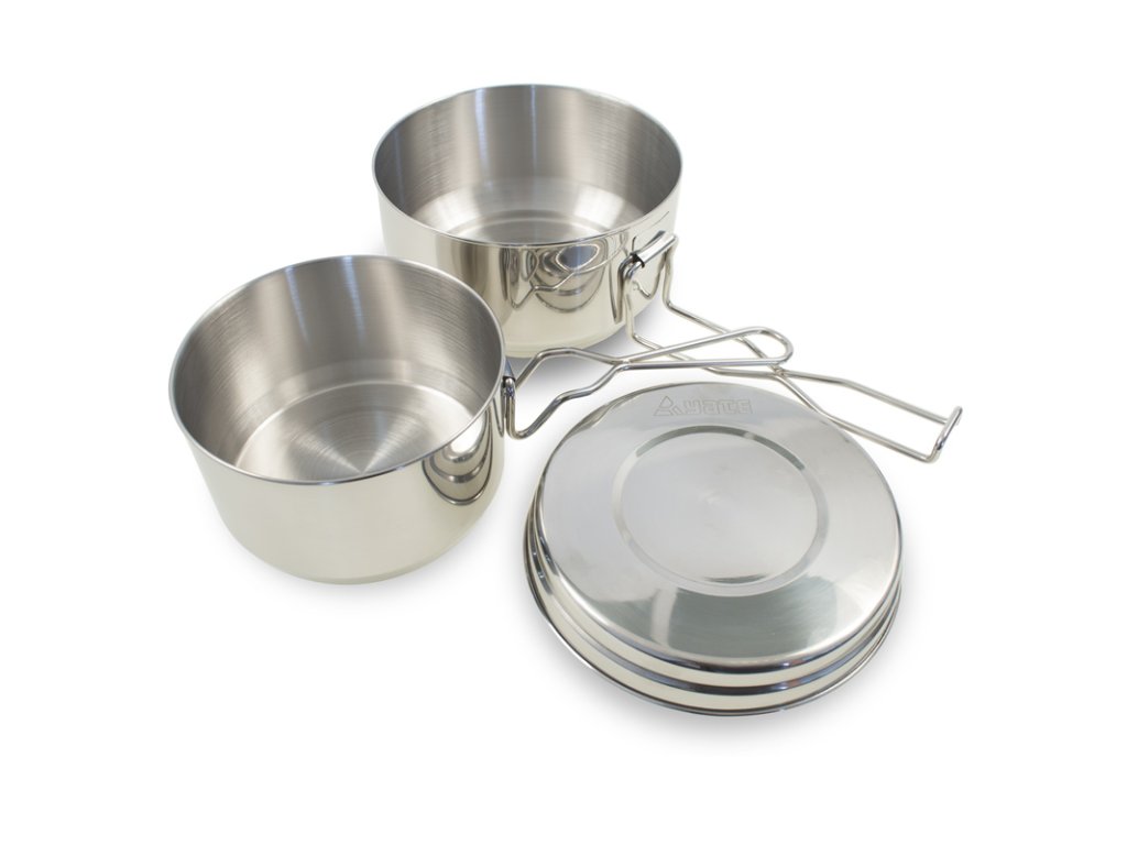 Sada nerezových ešusů z kvalitního pevného materiálu. Složení: velká miska 1,25 l, malá miska 0,85 l, víčko 0,3 l. Nerez je pro potraviny vhodnější než hliník.